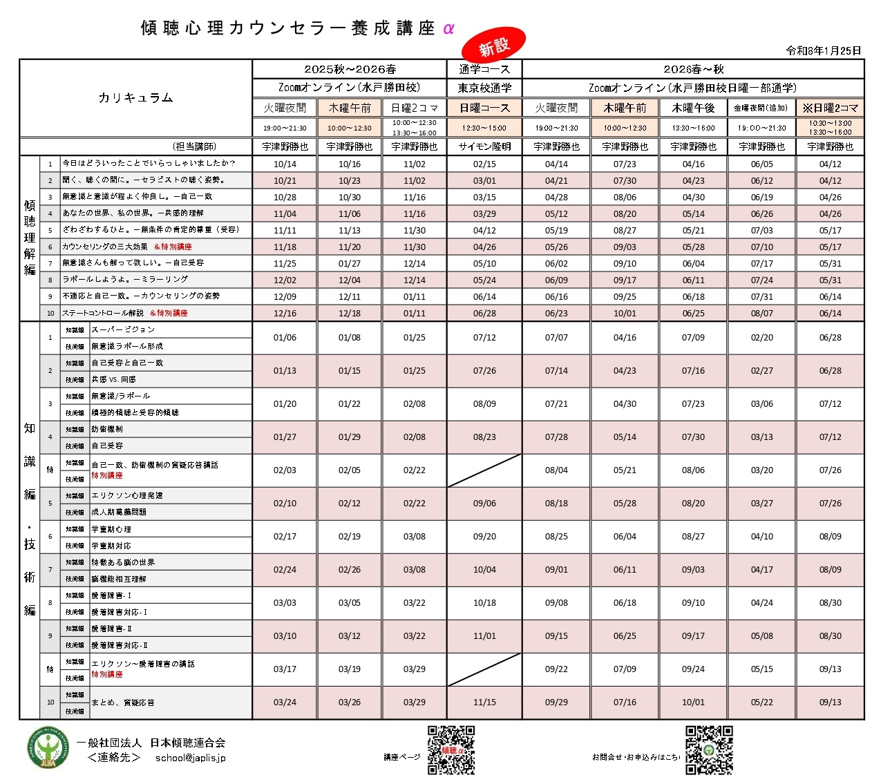 開催日程:傾聴心理カウンセラー養成講座α講座程|2026年1月25日更新