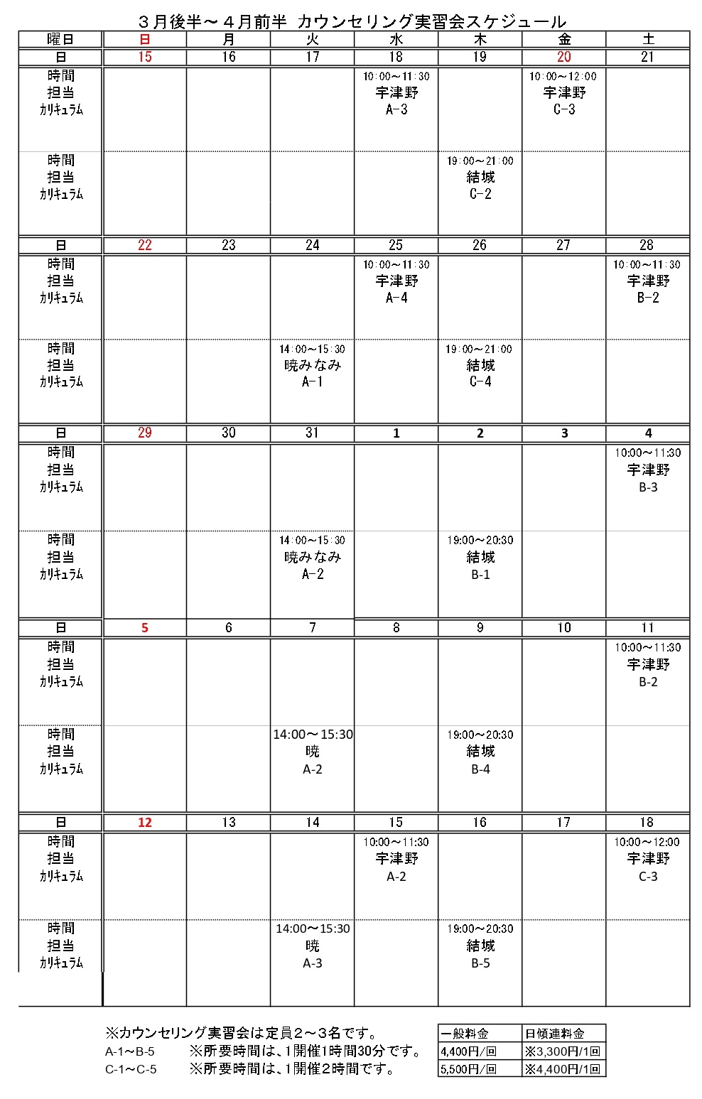 あら!実習(カウンセリング実習)の開催日程
