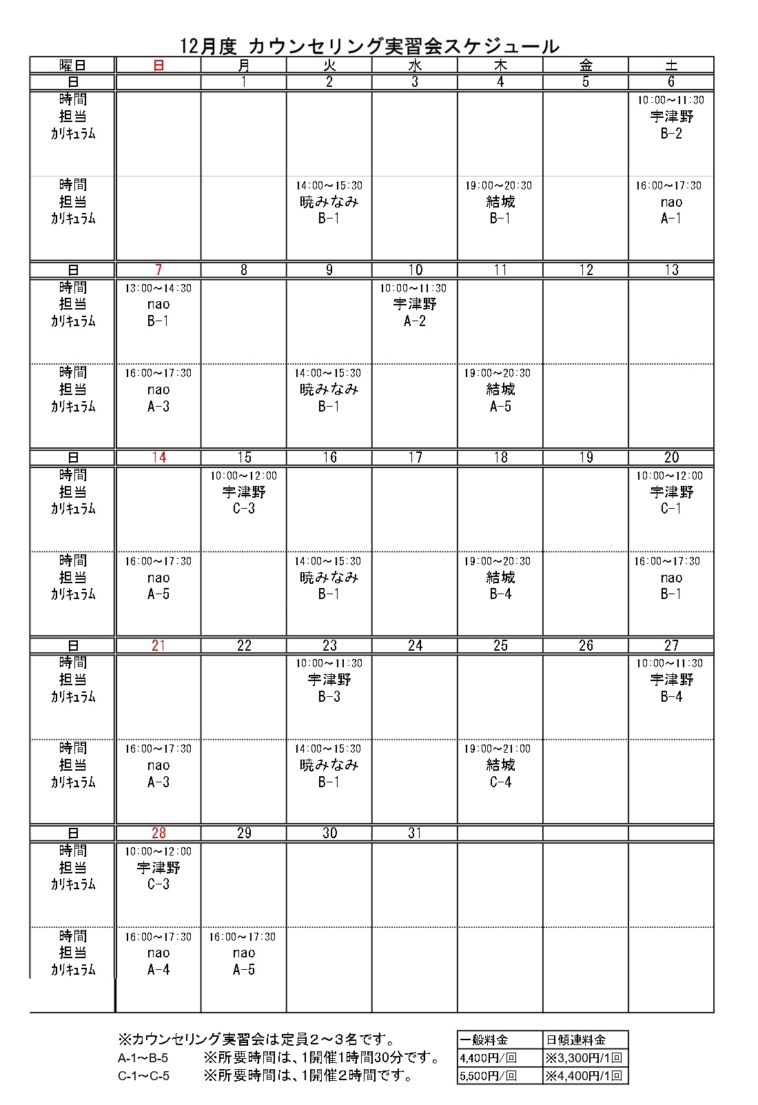 あら!実習(カウンセリング実習)の開催日程
